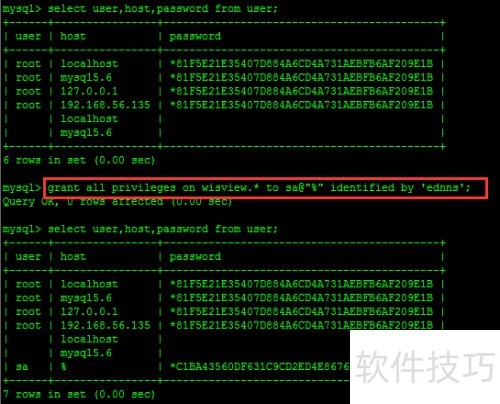 25、 所示,MySQL客户端远程连接只需将用户host设为%并赋予相应权限即可实现。