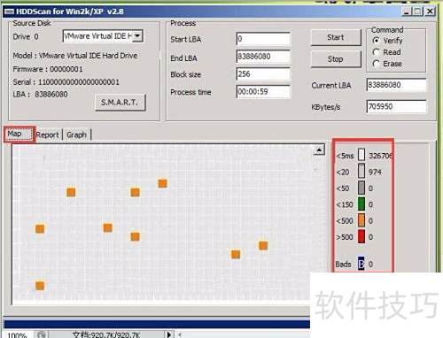 4、 扫描完成后可查看结果,切换至Map界面能更直观地了解硬盘扇区的扫描情况,包括扫描位置、速度及各扇区耗时等信息。需重点关注耗时超过500毫秒的区域和标记为Bads的部分。Bads代表硬盘存在坏道,若发现两个以上坏道,建议尽快申请保修。耗时超过500毫秒的区域可能存在潜在问题,可能是早期坏道或读取异常,也应引起重视。