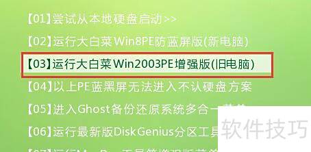 1、 重启计算机,通过快捷键启动U盘进入大白菜主界面,选择运行大白菜Win2003PE增强版(适用于旧设备)即可。