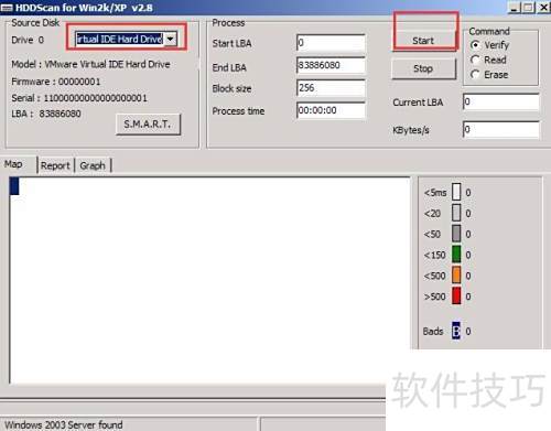 3、 启动HDDScan磁盘检测工具,点击Source Disk Drive 0旁的下拉箭头,选择目标磁盘,确认后点击Start按钮,即可开始对整个磁盘进行全面扫描,检测其健康状况与潜在问题。