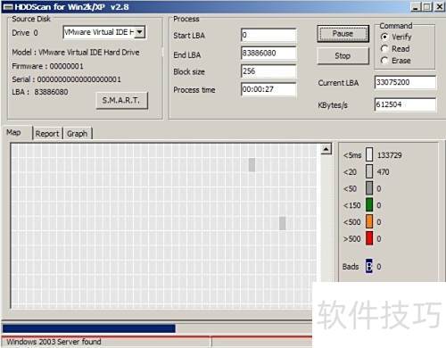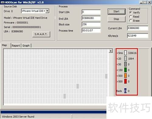 3、 启动HddScan磁盘检测工具,于Drive0中选定待检测的硬盘,随后点击Start按钮执行扫描操作,具体操作所示。