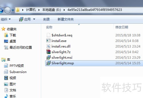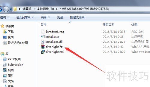 2、 请检查本地电脑的D盘、E盘或F盘,查找是否存在以4e95e213a8ba64f7934f8594957623命名的文件夹,参考图示样式。进入该文件夹后,确认其中是否包含Sliverlight安装清单文件。重点使用的是名为silverlight.7z的压缩包。右键点击该压缩包,选择解压到当前文件夹,解压后将获得一个名为Silverlight.msp的文件。请确保完成上述操作,将该文件准备妥当,以便后续使用。整个过程需在本地磁盘中完成,注意核对文件名称和路径准确性。