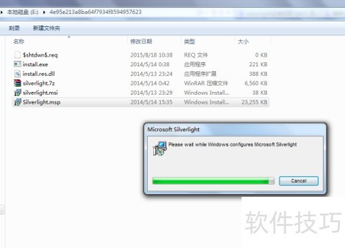 6、 返回到Silverlight安装清单文件所在目录,在先前安装失败且未关闭的界面下,直接双击已解压的Silverlight.msp文件继续安装。