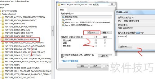 7、 在安装过程中,不同系统或电脑可能会出现各类错误提示,其中部分提示与Feature Control下的注册表子项有关。若在XP系统中遇到提示退出或重试的窗口,请勿直接关闭。首先定位到错误提示中涉及的注册表子项,例中标注的FEATURE_BROWSER_EMULATION项。右键点击该子项,选择权限,随后点击添加按钮,在弹出的输入框中键入everyone,确认添加。此时不要急于关闭权限窗口,关键步骤在于:在用户列表中选中everyone,然后在下方权限设置中勾选完全控制和读取两项,确保权限生效后再点击确定。完成设置后,返回原错误提示窗口,点击重试继续。系统可能再次弹出新的错误提示,此时需重复上述操作,针对新出现的注册表子项逐一进行相同的权限配置,直至所有相关子项均完成设置,安装方可顺利进行。整个过程需耐心操作,确保每一步权限修改准确无误。