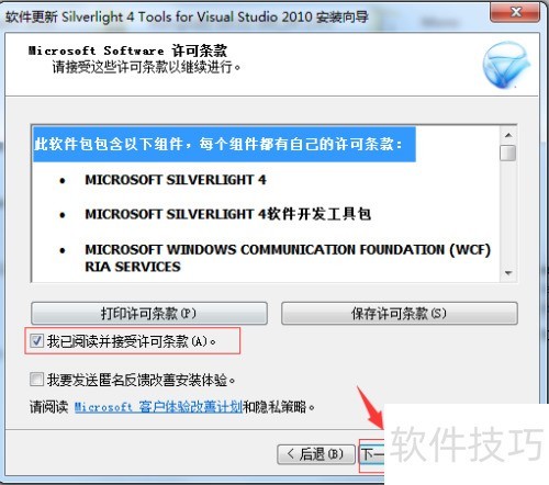 4、 请勾选我已阅读并接受许可条款(A),然后点击下一步(N),操作所示。