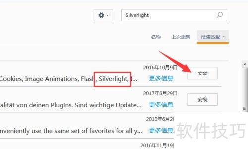 5、 第五,可通过直接输入插件名称进行查找,例如在搜索栏键入Silverlight后点击搜索,找到目标插件,随后点击右侧的安装按钮即可完成插件的安装操作。