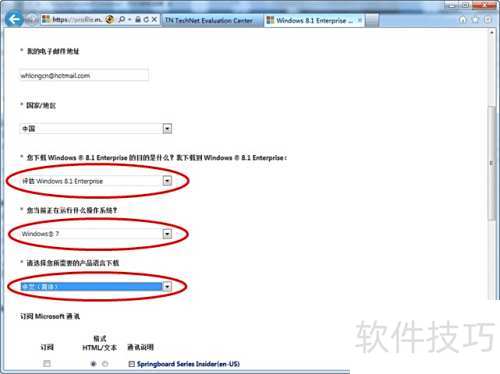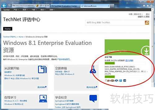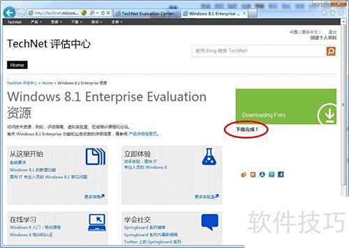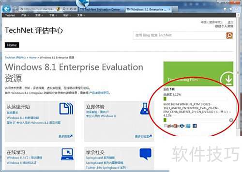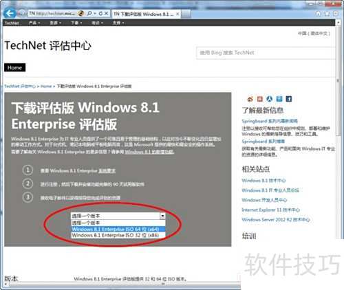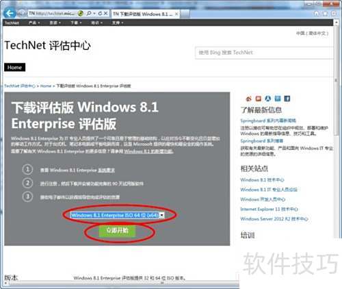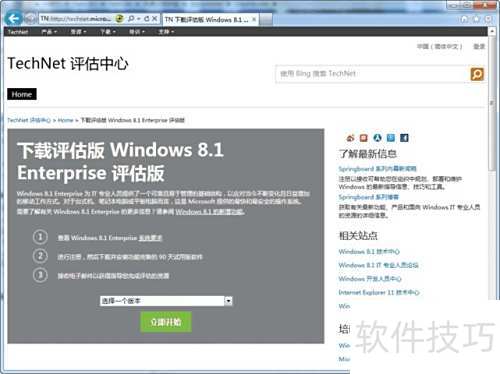2、 访问Windows 8.1企业版评估系统下载页面。