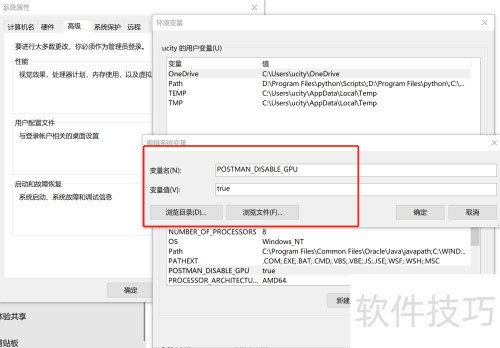 5、 在变量名称处填写:POSTMAN_DISABLE_GPU,对应变量值输入 true,保存设置后重启 Postman,程序即可恢复正常运行。