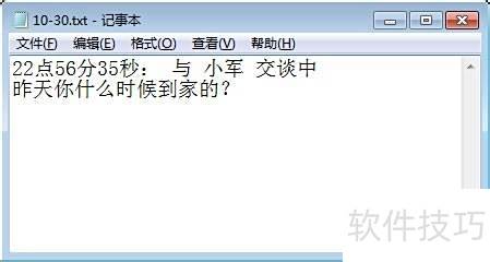 4、 在键盘记录的存储文件夹中,会生成一个以当天日期命名的文本文件,里面完整记录了当日所有的键盘输入内容,只需双击即可查看。所示,10月30日有人使用该电脑,在22点56分35秒向名为小军的网友发送了昨天你什么时候到家的?这一消息,相关信息均被准确记录在日志文件中。