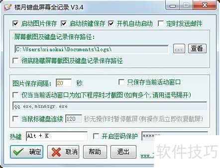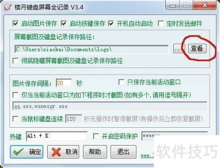 3、 重新启动软件后,按下Alt+K快捷键调出界面,点击图中红框标注的查看按钮,即可打开键盘记录的存储路径进行浏览。此外,也可直接访问记录保存的文件夹,例如本例中可进入C:UsersxiaokaiDocumentslogs目录,手动查看相关日志文件,操作简便,便于快速获取所需信息。