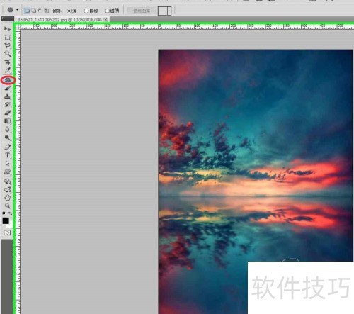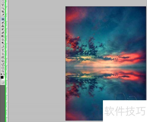 4、 用PS修补工具围绕照片中的小船绘制一个闭合区域。