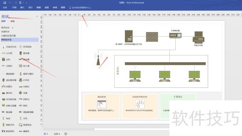 6、 通过左侧的形状图和工具栏中的功能,可开始绘制基础网络图,具体操作所示。