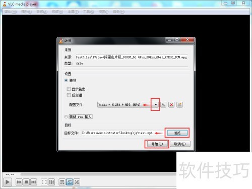 3、 在转换设置界面,于配置文件右侧的下拉列表中选择所需输出格式,如常用的H.264+MP3,也可选VP8、H.265或WMV等。随后在目标文件处点击浏览,指定转换后视频的保存位置,确认无误后点击开始按钮,即可启动转换进程,等待任务完成即可获取目标文件。