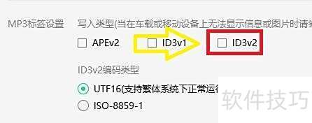 5、 在下载与缓存界面,勾选MP3标签设置中的ID3v2写入类型。