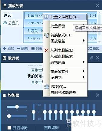 2、 修改信息十分简便!将所需MP3文件拖入播放列表,全选列表中的文件,右键点击第一个音乐项,选择批量文件属性即可统一修改。