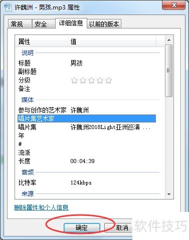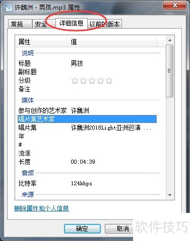 2、 在弹出的属性窗口中,点击详细信息标签,即可修改MP3文件的各项属性信息。