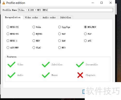 8、 在封装选项中,保持MP4 / MOV为选中状态。