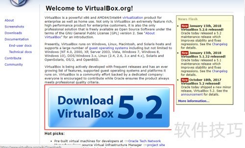 2、 打开页面后向下滚动,找到并点击Download VirtualBox 5.2按钮即可。