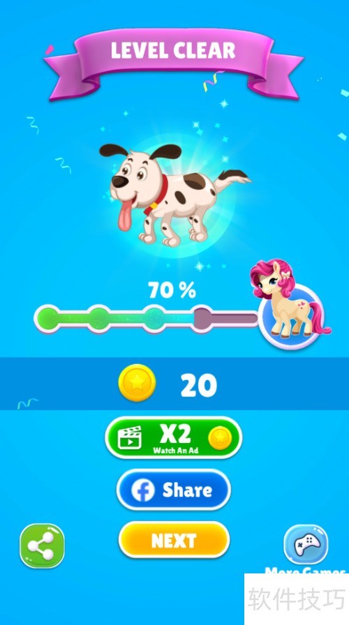 4、 小狗成功抵达终点,屏幕上显示LEVEL CLEAR,所示,任务完成。