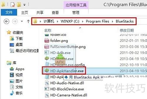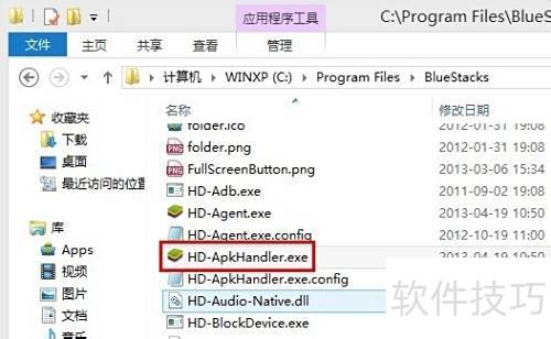 2、 进入Bluestacks的安装目录,通常位于C盘的Program Files文件夹内,找到名为BlueStacks的文件夹,打开后在里面查找HD-ApkHandler.exe这个程序文件。