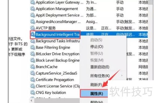 4、 右键点击后台智能传输服务,然后选择属性选项。