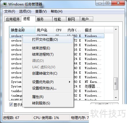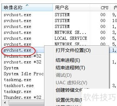 4、 打开任务管理器,找到可疑的svchost.exe进程,右键点击并选择打开文件所在位置,检查该文件路径是否为C:WindowsSystem32。若不在该目录下,则极有可能是病毒文件,需进一步查杀处理。