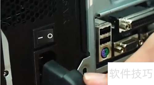 3、 将电源线一端接电脑,另一端插电源插座,如有开关需打开以通电。