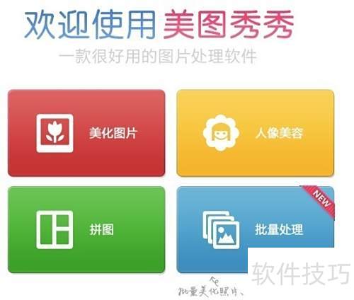 2、 下载并安装美图秀秀软件,完成后启动程序。主界面显示美化图片人像美容拼图批量处理四个功能选项,根据实际需求选择相应功能,此处以人像美容为例进行操作。