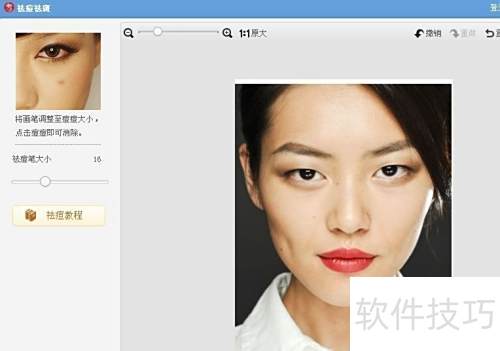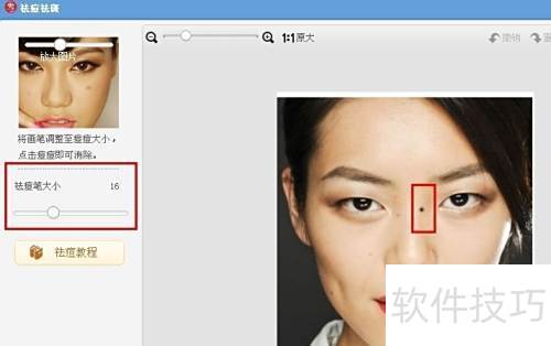3、 首先打开人像美容功能,导入照片后选择祛痘祛斑选项。根据痣的大小调节祛痘笔的尺寸,较大的痣可适当调大笔触。移动鼠标至照片上,会出现一个小圆圈,精准定位到面部有痣的位置,轻轻点击即可去除。