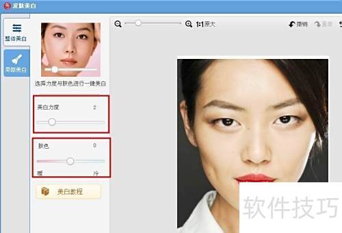 4、 美白肌肤是每位爱美人士的心愿。打开美图秀秀,选择皮肤美白功能,灵活调节美白强度与肤色选项,轻松打造理想中的白皙透亮肌肤,直至达到满意效果。