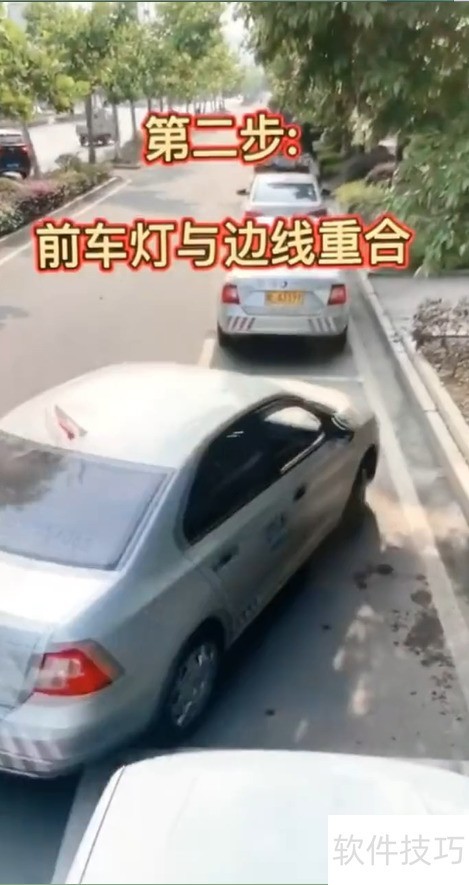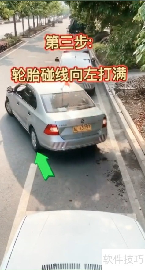 4、 倒车至轮胎触线时,迅速向左打满方向即可完成操作。