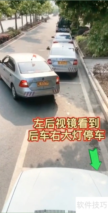 3、 当左后视镜中出现后车右大灯时立即停车。