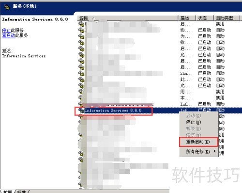 3、 找到Informatica服务,右键点击并选择重启,等待服务完全启动后,工作流即可恢复正常运行。