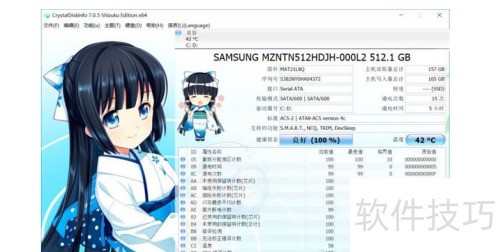 15、 检测硬盘常用软件有HD TUNE和CrystalDiskInfo,可通过这些工具查看硬盘健康状况。首先介绍CrystalDiskInfo的界面布局,具体界面所示,直观展示硬盘各项参数信息。