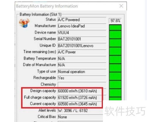 19、 这里推荐一款专业电池检测工具——Batterymon。该软件能够显示电池的累计运行时间(理论值),实时监测当前电量及预估剩余使用时间。安装并启动程序后,用户将看到清晰的界面信息。通常情况下,全新笔记本电池的初始电量应低于3%。通过查看设计容量与完全充电容量两项数据,可判断电池状态:对于全新电池,这两个数值应完全一致。若存在明显差异,说明电池可能存在损耗或老化。此外,软件还能统计电池的充放电循环次数。一般而言,全新的笔记本电池充放电次数不应超过3次,若次数过多,则表明该设备可能已被他人使用过,非全新状态。因此,借助此类管理工具,用户可全面了解电池健康状况,有效辨别笔记本是否为原装新机。