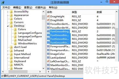 2、 进入注册表路径 HKCUControl PanelDesktop,查找以 FontSmoothing 开头的四个键值,依次将其数值修改为 2、0、1、2,完成设置后保存即可生效。
