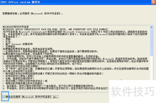3、 下载完成后,启动Office 2007兼容包,勾选同意许可条款,然后点击继续按钮,操作所示。
