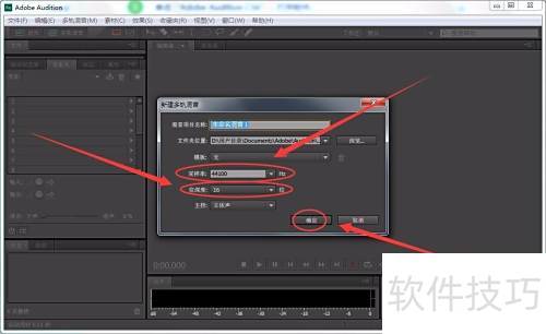 3、 将采样率设为44100,位深度设为16位,然后点击确定按钮确认设置。