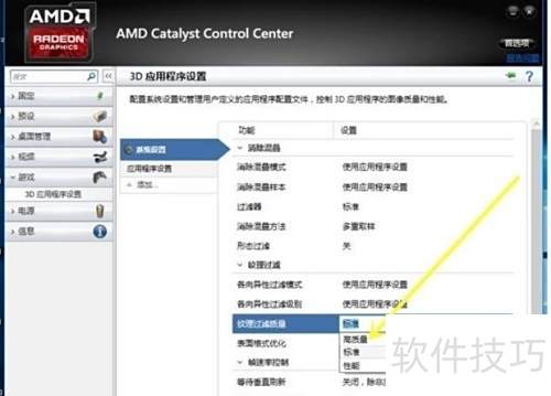4、 将3D应用设置中的纹理过滤调至高质量,镶嵌模式设为AMD优化,最后点击应用保存设置。
