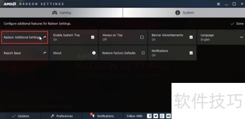 4、 打开AMD显卡设置界面后,众多选项中选择Radeon附加设置,即可进入显卡性能调节页面,进行相关参数配置与优化,满足不同使用需求。