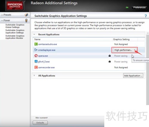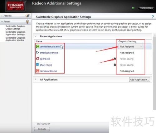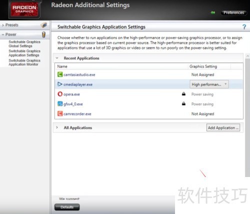 5、 在该设置界面中,主窗口左侧显示常用应用程序,右侧则展示AMD显卡当前配置,多数项目显示为无设置或处于省电模式,表明尚未进行个性化调整,系统默认以节能优先方式运行显卡功能。