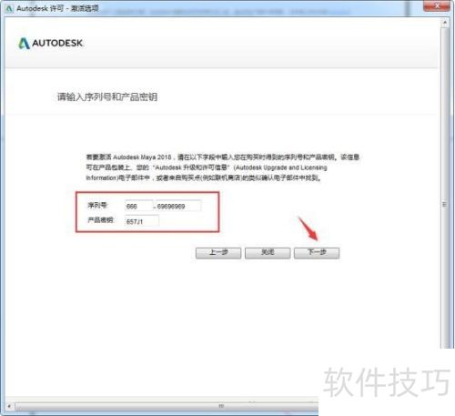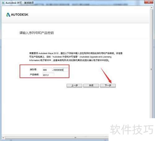 17、 请输入产品序列号和密钥,推荐使用通用码666-69696969和657J1,填写后点击下一步即可继续操作。