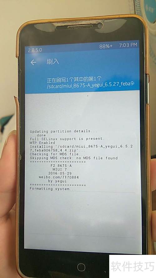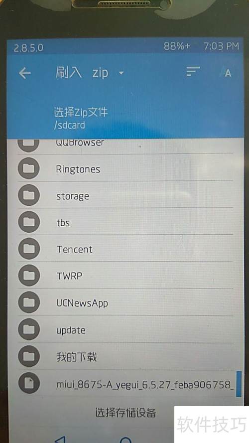 5、 刷入recovery后,一所示,选择安装进入手机存储,找到已下载的MIUI刷机包,点击该包开始刷入,操作三所示。等待数分钟直至完成,随后重启设备即可。