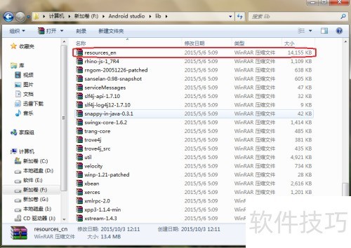 2、 进入Android Studio的安装目录,找到并打开其中的lib文件夹,将名为resources_en的文件复制并粘贴到桌面,以便后续使用。例如路径可能是F:Android Studiolib esources_en。