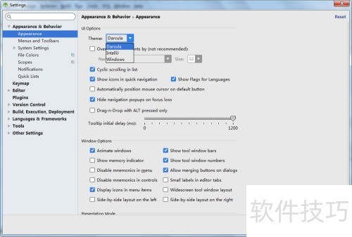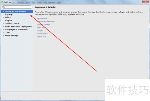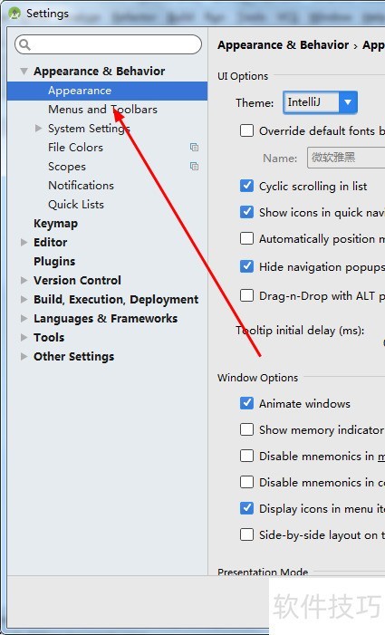 5、 在appearance&behavior下拉菜单中,选择appearance以调整外观设置。
