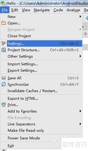2、 在Android Studio中,点击菜单栏的File,然后选择Settings进行设置。