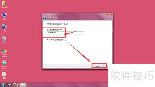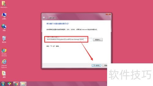3、 在快捷方式属性的输入框内,键入命令:%SYSTEMROOT%System32dwmapi 105,随后点击下一步按钮,继续后续操作,具体界面参考附图所示步骤进行。