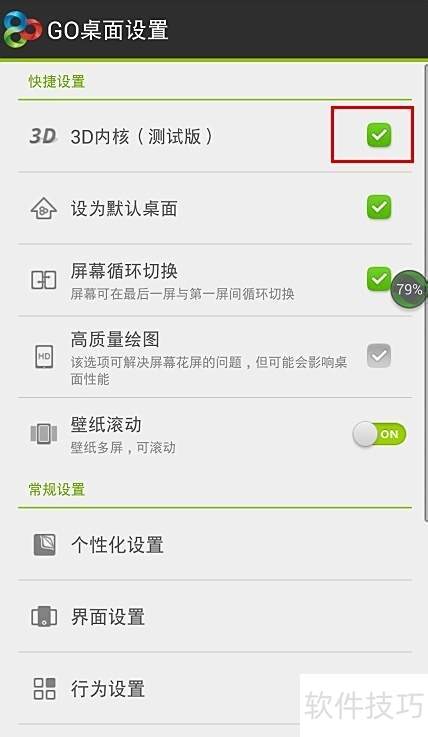 3、 在快捷设置里,勾选3D内核右侧的复选框,操作所示。