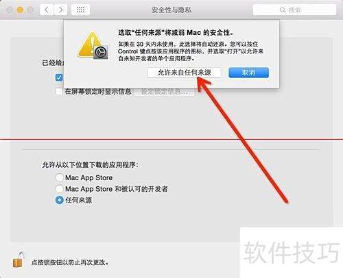 6、 现在可选择在Mac上安装任意来源的软件,点击任何来源即可开启。