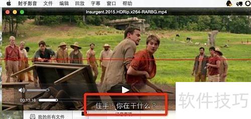 12、 将视频文件拖入射手播放器,软件会自动在线搜索并匹配多个字幕。播放至13分16秒时暂停,画面已成功显示字幕,准备就绪。